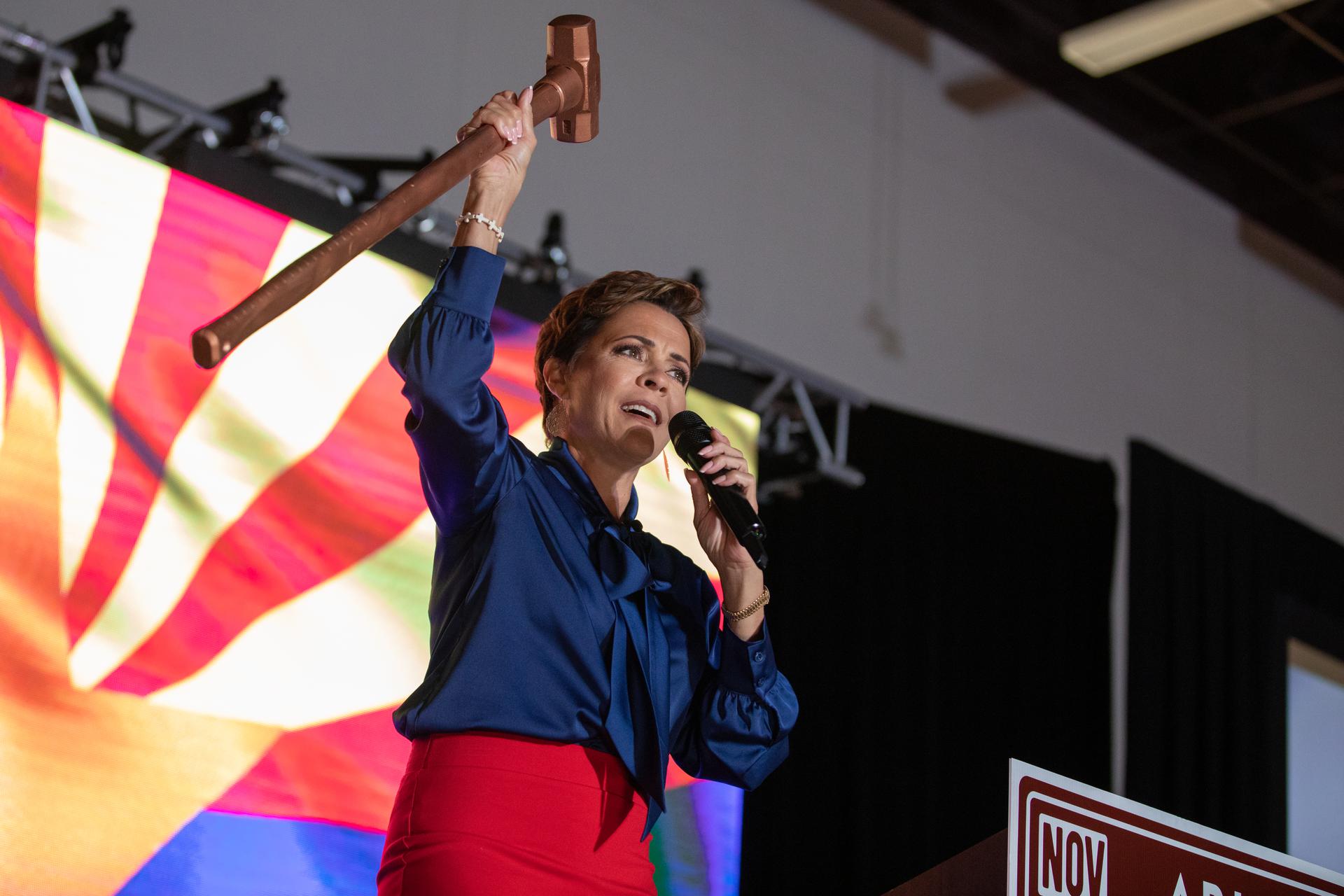 Kari Lake, Republican gubernatorial candidate for Arizona, waves a sledgehammer during an Election Night Party in Scottsdale, Arizona, US, on Tuesday, Aug. 2, 2022. (Caitlin O'Hara/Bloomberg via Getty Images) |