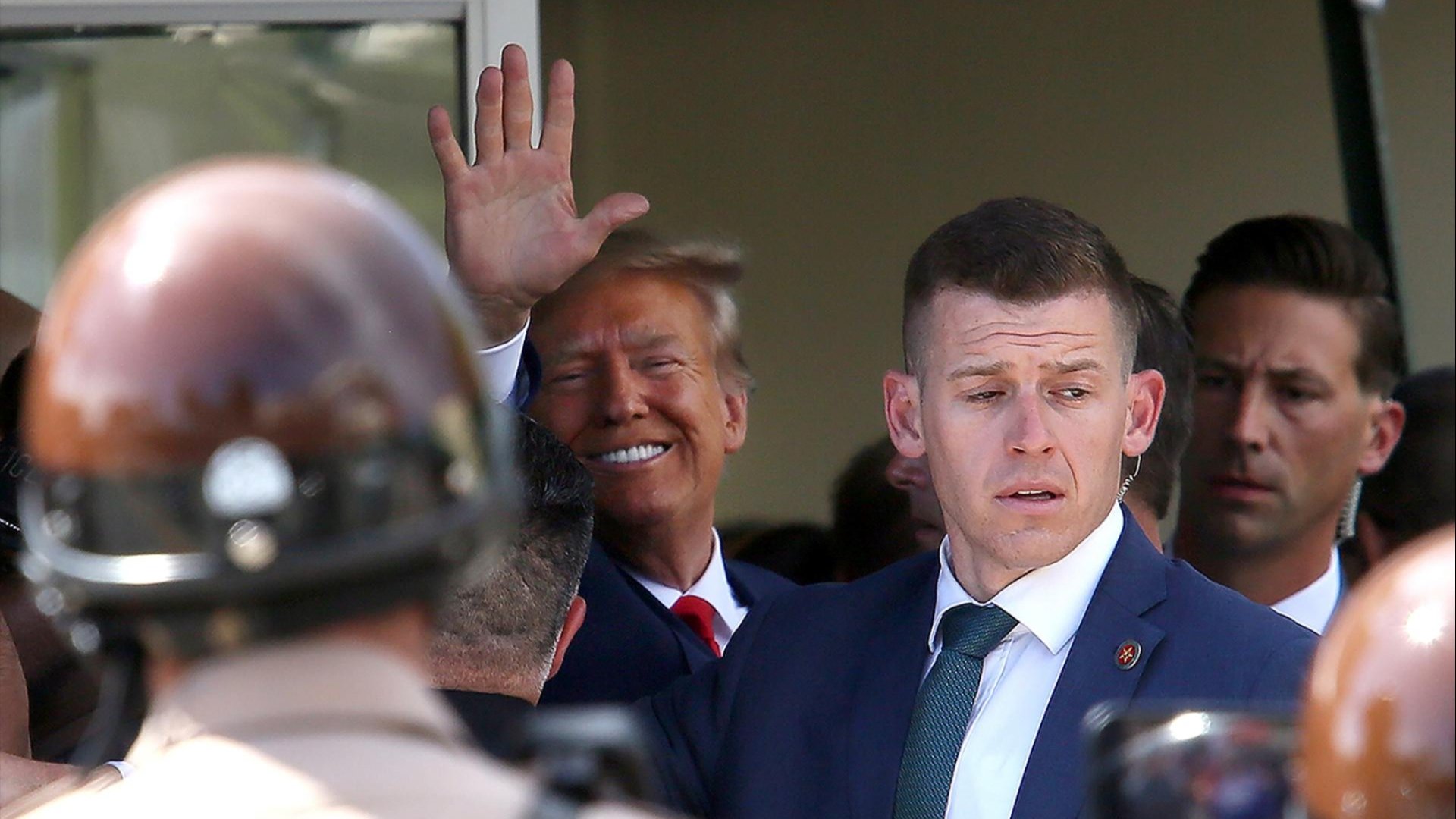 Former U.S. President Donald Trump waves as he makes a visit to the Cuban restaurant Versailles after he appeared for his arraignment on June 13, 2023 in Miami, Florida. (Alon Skuy/Getty Images) |