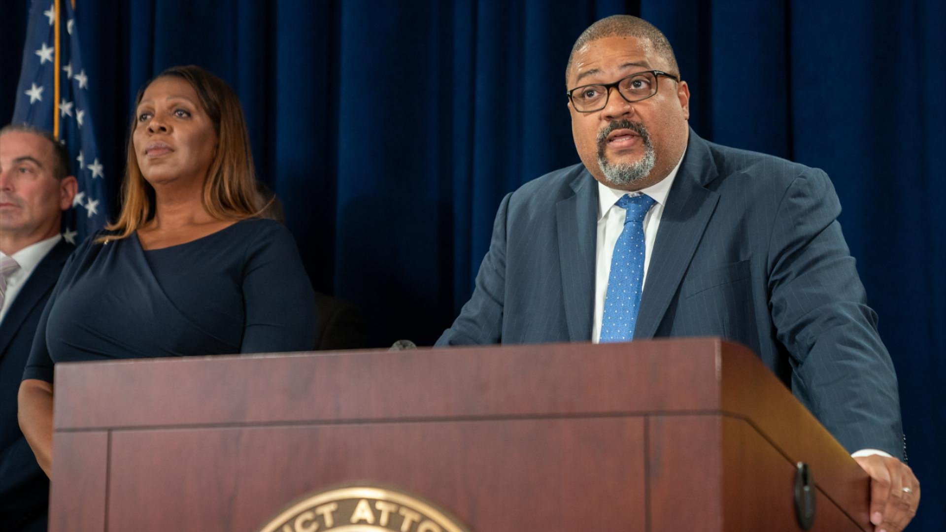 New York State Attorney General Letitia James (L) looks on as Manhattan District Attorney Alvin Bragg speaks at a press conference after Steve Bannon, former advisor to former President Donald Trump surrendered at the NY District Attorney's office to face charges on September 08, 2022 in New York City. (David Dee Delgado/Getty Images) |
